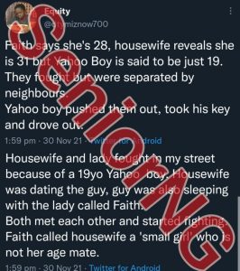Faith says she’s 28, housewife reveals she is 31 but Yahoo Boy is said to be just 19. They fought but were separated by neighbours.