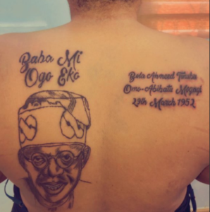 A Nigerian lady who is apparently a diehard fan of former Lagos state governor, Chief Bola Ahmed Tinubu, has tattooed his face, name and date of birth on her back.