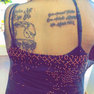 A Nigerian lady who is apparently a diehard fan of former Lagos state governor, Chief Bola Ahmed Tinubu, has tattooed his face, name and date of birth on her back.