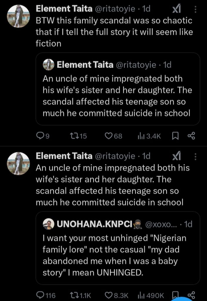 The lady wrote, “An uncle of mine impregnated both his wife’s sister and her daughter. The scandal affected his teenage son so much he committed suicide in school