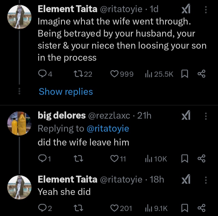 “Imagine what the wife went through. Being betrayed by your husband, your sister & your niece then loosing your son in the process”