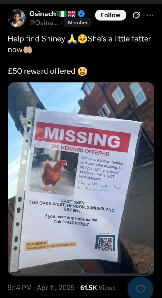 A printed notice included in the post further reads: “Shiney is a brown female bird who went missing on 6th April 2025 at around 14:00 hours. She is not microchipped.”