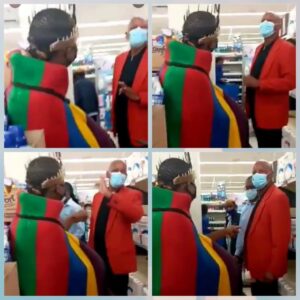 The man continues to tell Mahlangu that the mall is a public place and he is dressed indecently, while Mahlangu responds by saying he is dressed in African attire.