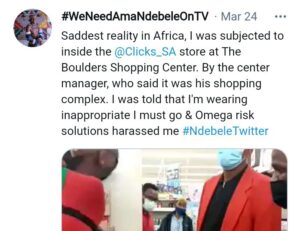 Saddest reality in Africa, I was subjected to inside the @Clicks_SA store at The Boulders Shopping Center. By the center manager, who said it was his shopping complex. I was told that I'm wearing inappropriate I must go & Omega risk solutions harassed me #NdebeleTwitter pic.twitter.com/klzmTQspJO