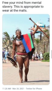 His sin, apparently, was that he went into the Boulders shopping centre wearing Ndebele traditional attire. The Ndebele are one of South Africa’s minority ethnic groups.