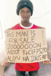 Idris, who claimed to be a tailor, has been roaming the streets of Kano State carrying a placard that reads “This man is for sale for N20 million.”