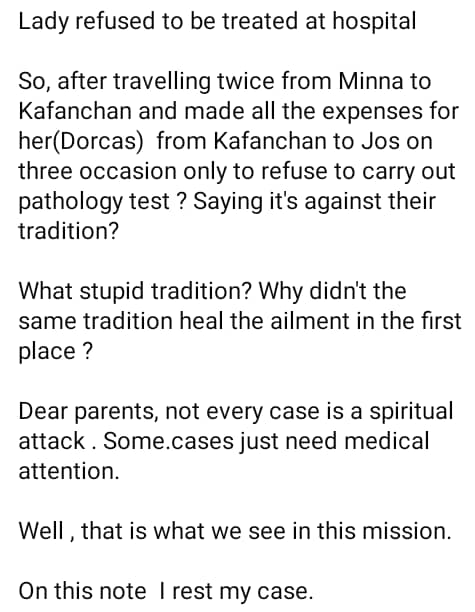 So, after travelling twice from Minna to Kafanchan and made all the expenses for her (Dorcas) from Kafanchan to Jos on three occasion only to refuse to carry out pathology test ? Saying it’s against their tradition? What stupid tradition? Why didn’t the same tradition heal the ailment in the first place? Dear parents, not every case is a spiritual attack . Some cases just need medical attention. Well , that is what we see in this mission. On this note I rest my case.” he wrote.