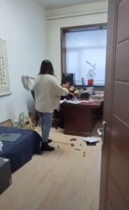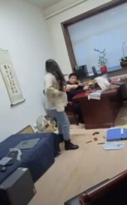 In the 14-minute video which has gone viral on Chinese social media Weibo, Zhou is also seen pouring water over her boss.