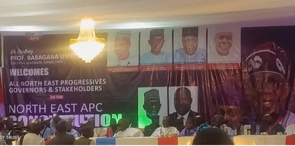 The banner featured images of President Bola Ahmed Tinubu, five APC governors from the North-East and the National Legal Adviser, but omitted the vice-president, who hails from Borno State.