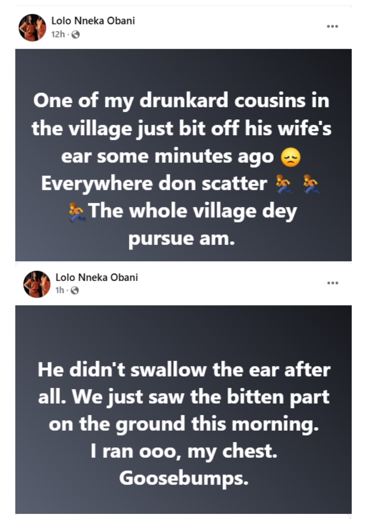 “One of my drunkard cousins in the village just bit off his wife’s ear some minutes ago. Everywhere don scatter. The whole village dey pursue am,” she wrote.