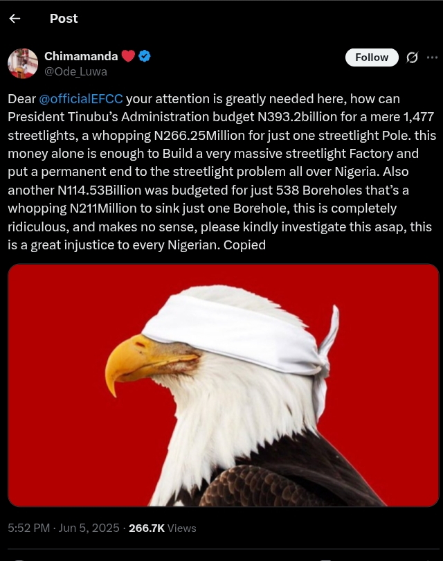 In the post, the user wrote: “Dear @officialEFCC, your attention is greatly needed here. How can President Tinubu’s administration budget ₦393.2 billion for just 1,477 streetlights—₦266.25 million for a single streetlight pole? This amount is enough to build a massive streetlight factory and solve Nigeria’s streetlight problems permanently.”