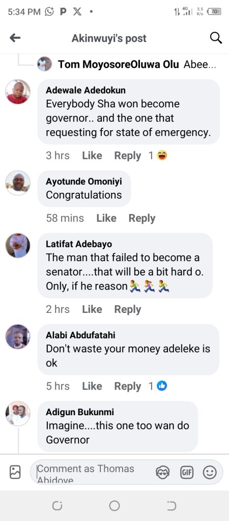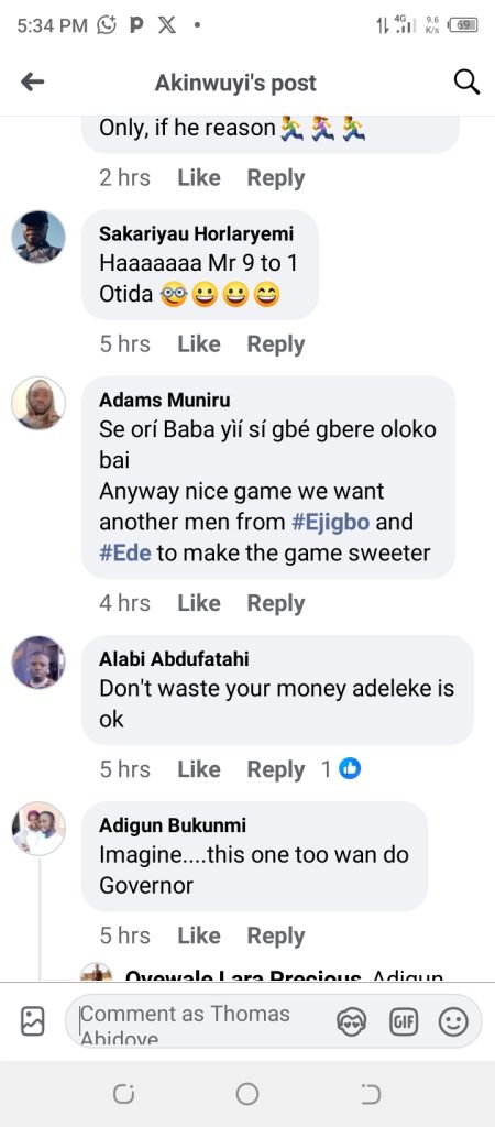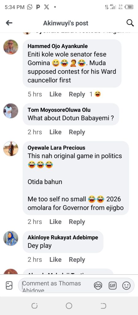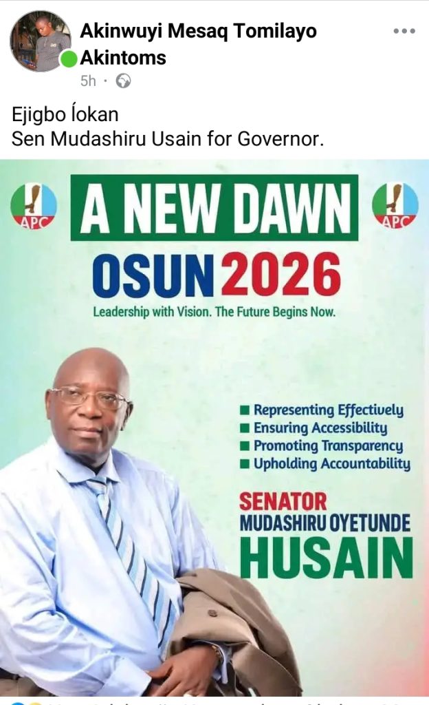 The campaign poster was shared by Facebook user Akinwuyi Mesaq Tomilayo on Monday, with the caption, “Ejigbo lókan. Sen Mudashiru Usain for Governor,” suggesting that it is the turn of Ejigbo, a town in Osun State, to produce the next governor.