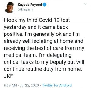 I took my third Covid-19 test yesterday and it came back positive. I’m generally ok and I’m already self isolating at home and receiving the best of care from my medical team. I’m delegating critical tasks to my Deputy but will continue routine duty from home. JKF