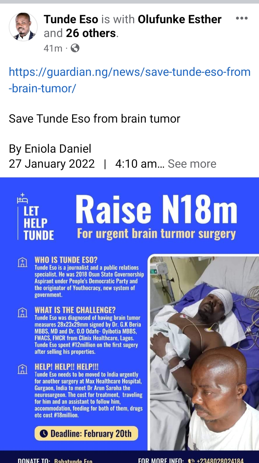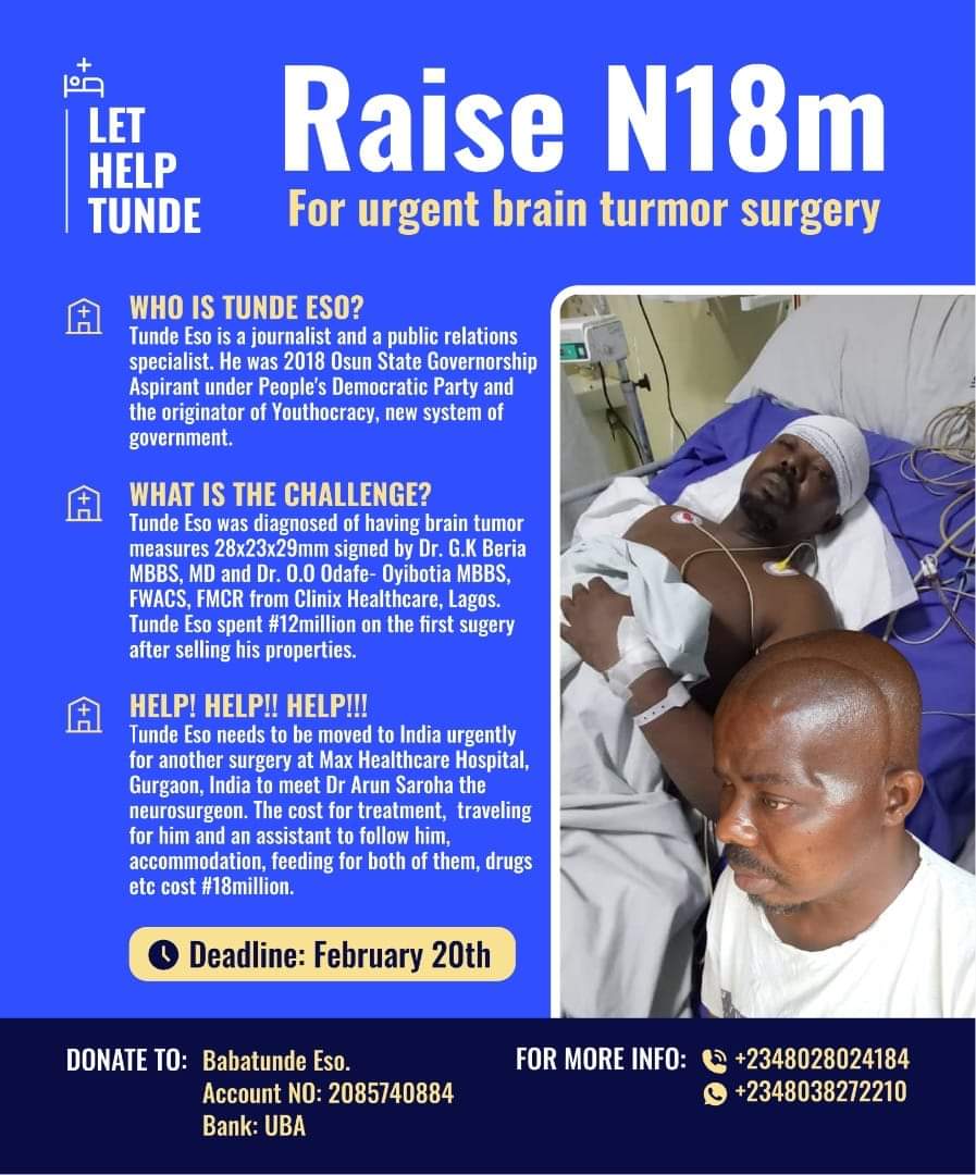Tunde Eso, an author, journalist and one-time governorship aspirant in Osun State, is losing his life to brain tumor and needs help to get back on his feet.