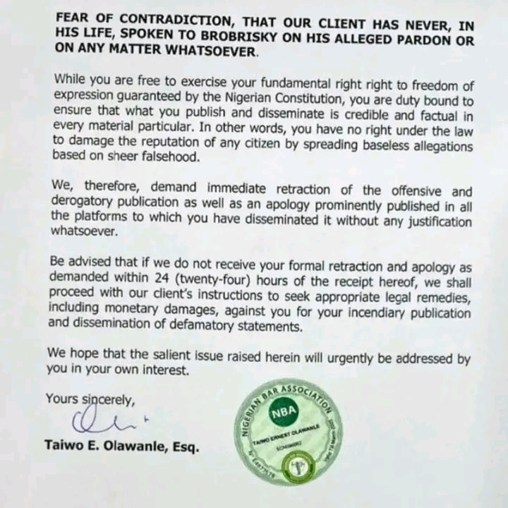“The entire publication was a vicious, wicked and reckless ploy to impugn the reputation of our client and lower him in the estimation of right-thinking members of the public. We wish to state, without any fear of contradiction, that our client has never, in his life, spoken to Bobrisky on his alleged pardon or on any matter whatsoever.