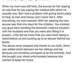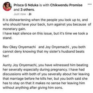 “Rev Okey Onyemachi and Joy Onyemachi, you both cannot deny knowing that my sister’s husband beats her! Aunty Joy Onyemachi, you have witnessed him beating her severally especially during pregnancy. I have had discussions with both of you severally about her leaving that marriage before he kills her, but you both said she has has to stay on that it makes no sense her leaving him without anything after giving him sons.”