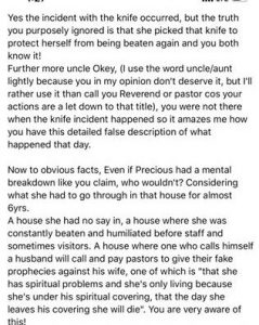 “Yes the incident with the knife occurred, but the truth you purposely ignored is that she picked that knife to protect herself from being beaten again and you both know it! Further more uncle Okey, (I use the word uncle/aunt lightly because you in my opinion don’t deserve it, but I’ll rather use it than call you Reverend or pastor cos your actions are a let down to that title), you were not there when the knife incident happened so it amazes me how you have this detailed false description of what happened that day.