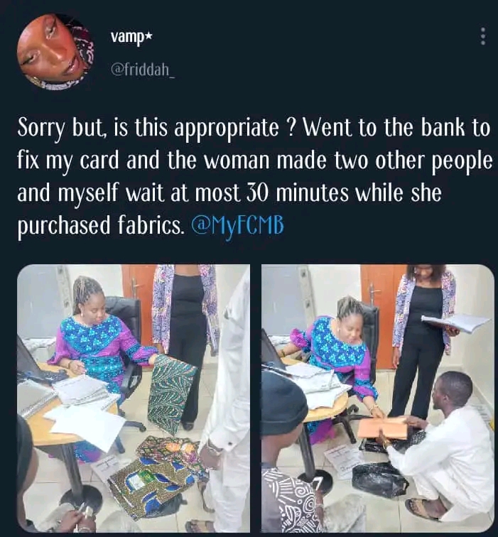 Lady on Twitter has called out a banker at FCMB who kept her and two other people waiting for over 30 minutes while she purchased fabrics.