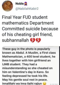 A final year student of the Federal University of Dutse, Jigawa State identified as Abdul, has reportedly committed suicide after his girlfriend cheated on him.