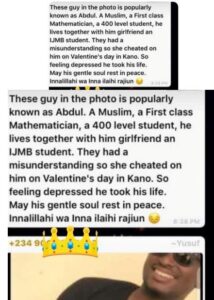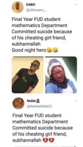 A final year student of the Federal University of Dutse, Jigawa State identified as Abdul, has reportedly committed suicide after his girlfriend cheated on him.