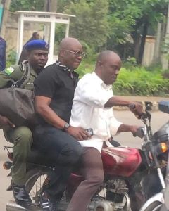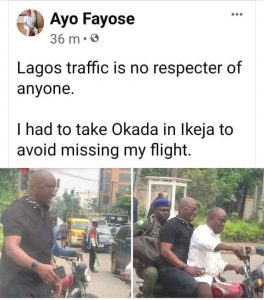 Stuck in Lagos traffic, former Ekiti State Governor, Ayo Fayose boarded an Okada with his Police escort in Ikeja, in order to avoid missing his flight.