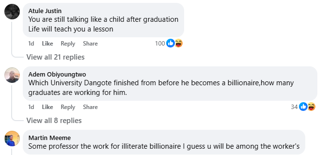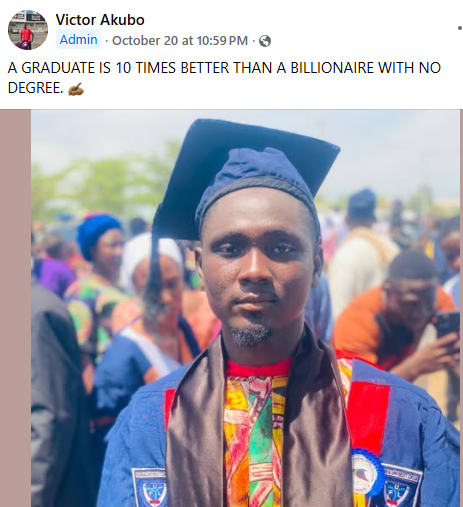 A Nigerian man, Victor Akubo, who graduated from the Federal University Lokoja (FUL) a few days ago has declared that a graduate is 10 times better than a billionaire without a university degree.