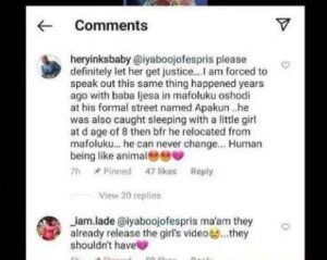 “@iyaboojofespris please let her get justice… I am forced to speak out this same thing that happened years ago with baba Ijesha in mafoluku Oshiodi at his formal street named Akakun… he was also caught sleeping with a little girl at the age of 8 then before he relocated from mafoluku… he can never change…Human-like animal”.