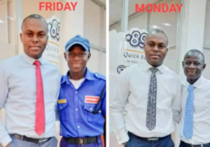 The picture showed us together on his last day as a security guard on FRIDAY and his First day inside the branch the following MONDAY.