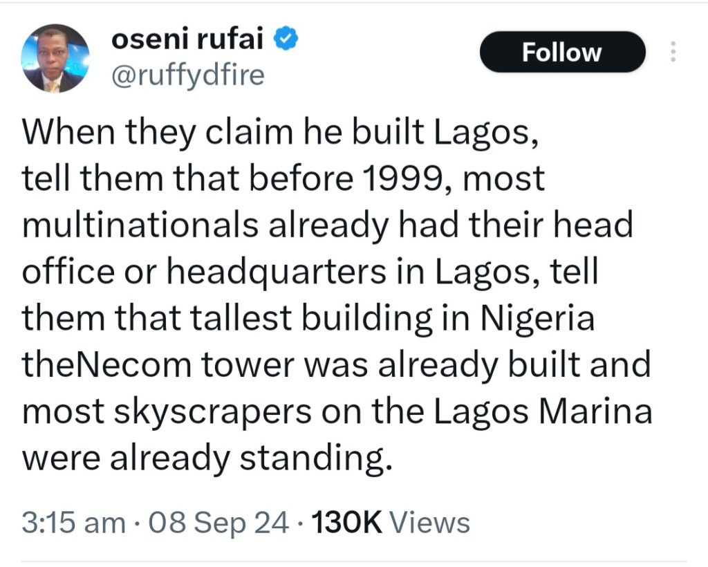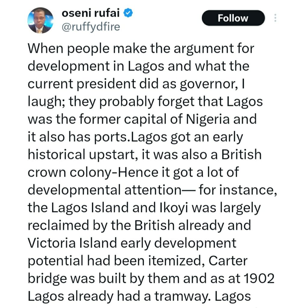 Journalist, Rufai Oseni has countered Nigerians who claim that President Bola Ahmed Tinubu developed Lagos state when he was governor.