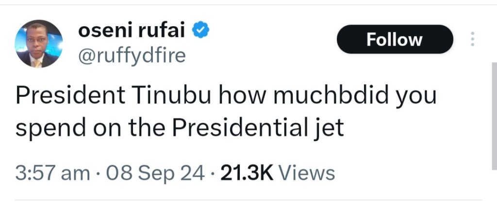 He also gave other reasons before asking Tinubu how much he spent on purchasing the presidential private jet.