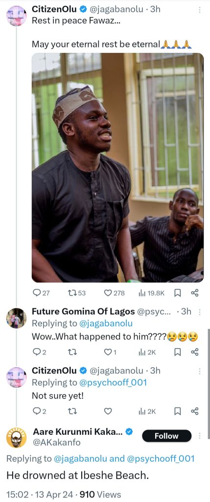 An activist known as Fawaz Alabi has drowned in Lagos.