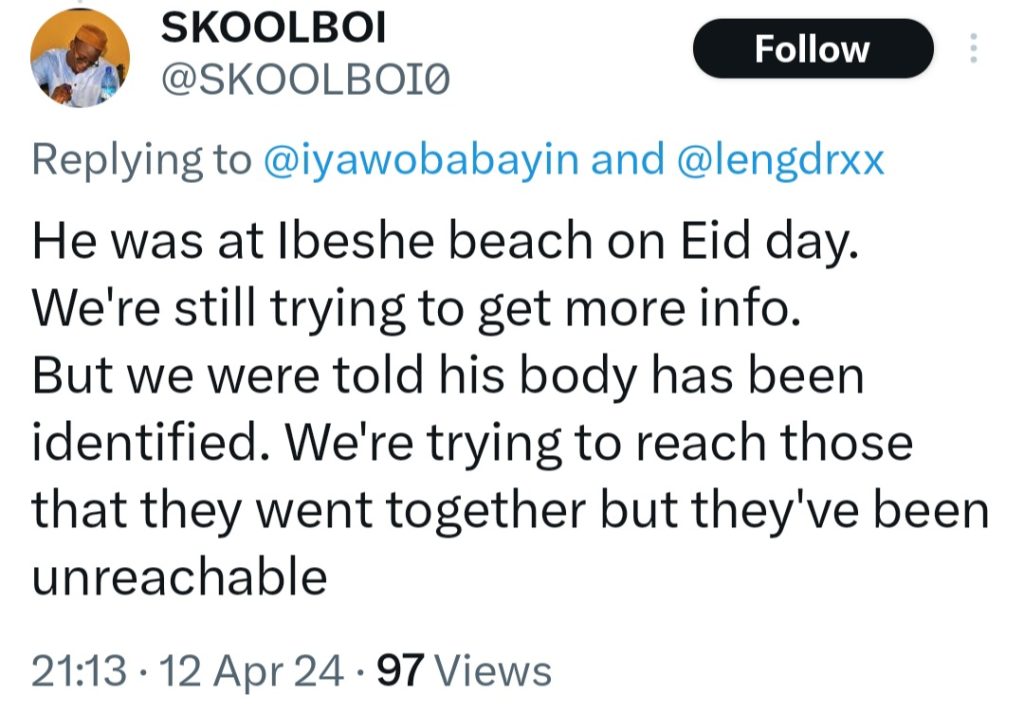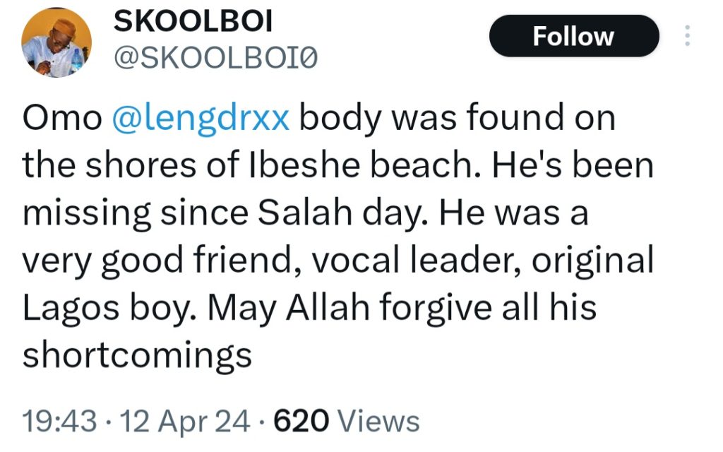 His body was recovered Friday, April 12, on the shores of Ibeshe beach in Lagos.