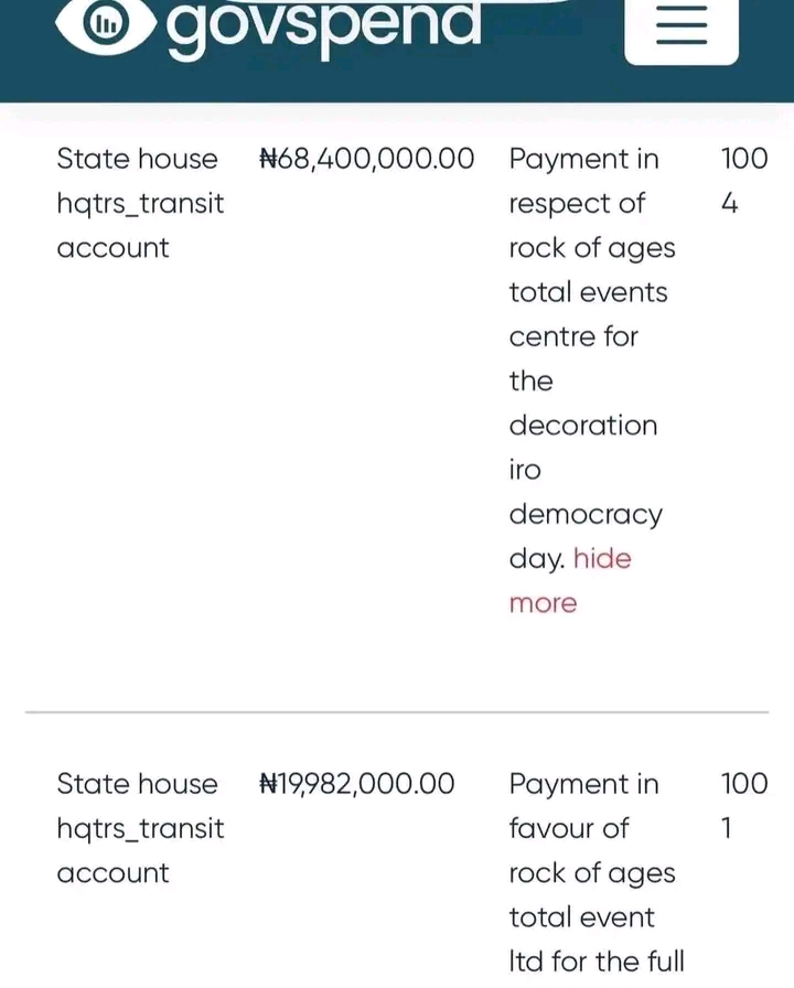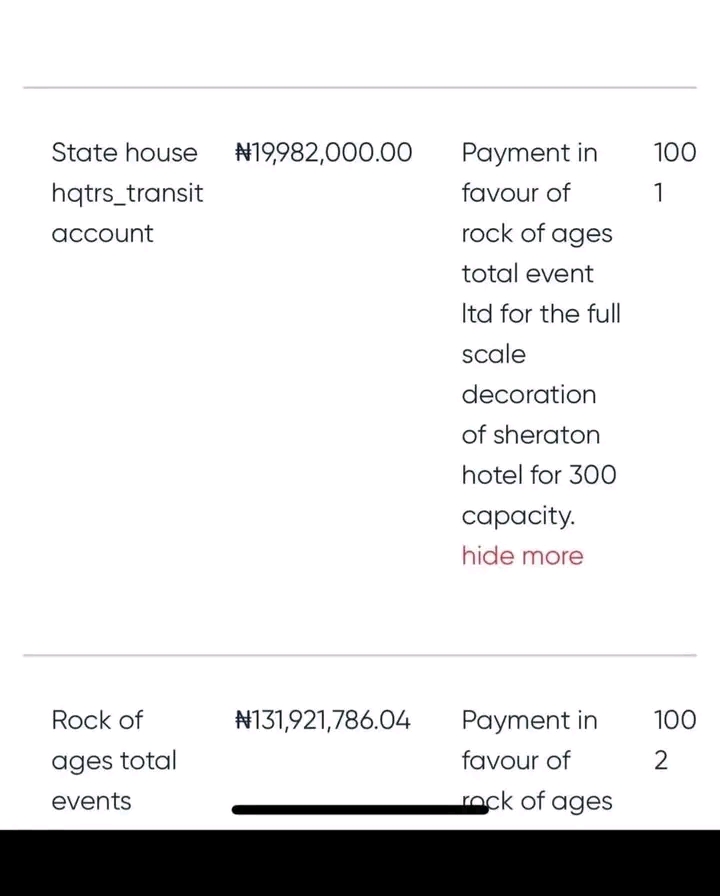 On May 24, 2024, Rock of Ages Total Events Centre Ltd received the sum of N131,921,786 for full-scale decoration of State House events for the First Lady’s programmes for women, youth, and children.