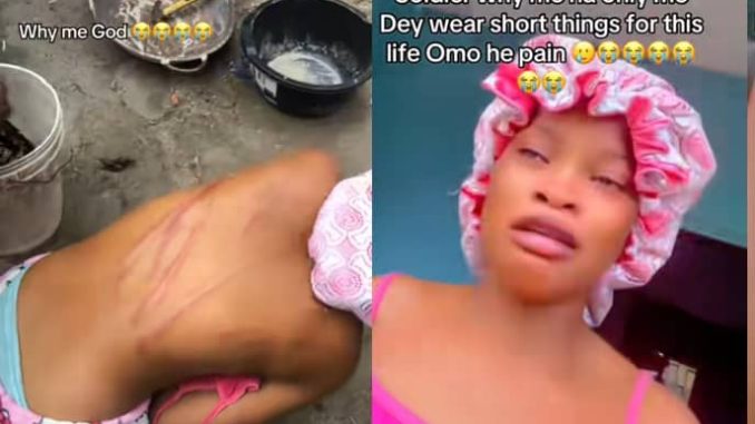 The caption of the video reads: “Soldier why? Na only me dey wear short things for this life?” expressing disbelief and distress over the incident.