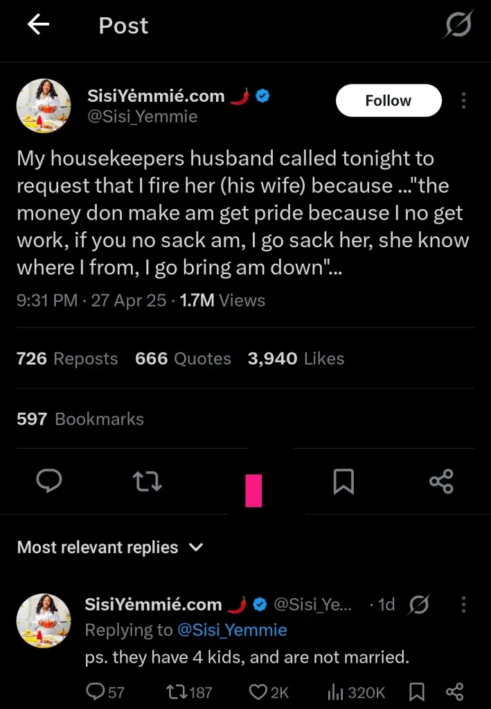 @OBlezzings: “If you sack her, how would they survive as he can’t even fend for the family since he doesn’t have a job yet? How did she even manage to give birth to 4 children for an enemy within? Hmmm.”