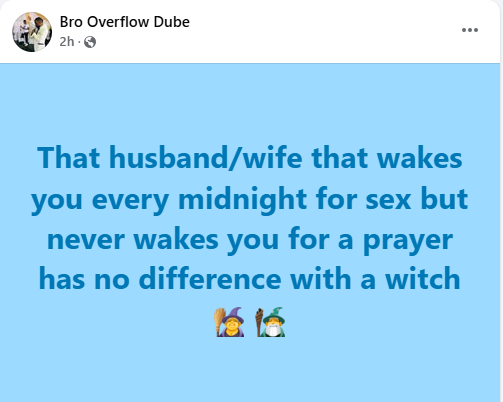 A South African prophet, Overflow Dube, has said that a husband or wife who wakes their spouse every midnight for s3x but never does the same for prayer is comparable to a witch.