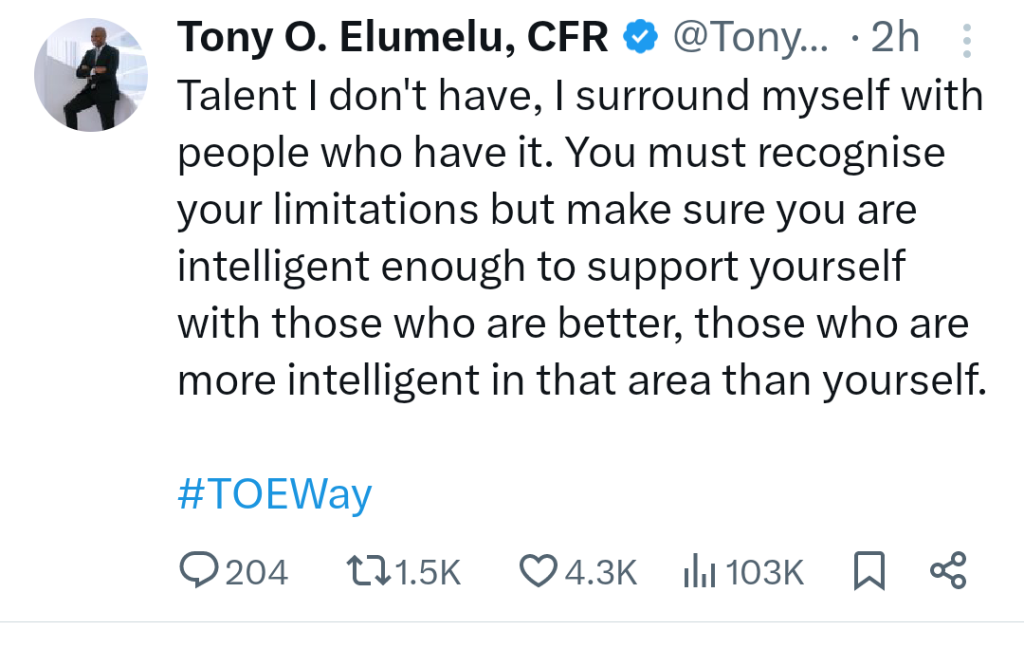 Taking to his X account on Monday morning, July 8, the UBA bank supremo said though he doesn’t have talent, he surrounds himself with very talented people.