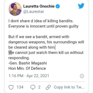 “I don’t share the idea of killing bandits. Everyone is innocent until proven guilty but if we see a bandit, armed with dangerous weapons, his surroundings will be cleared along with him. We cannot just watch them kill us without responding,” Magashi was quoted as saying.
