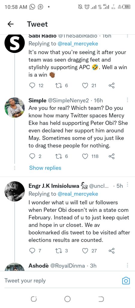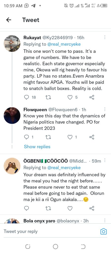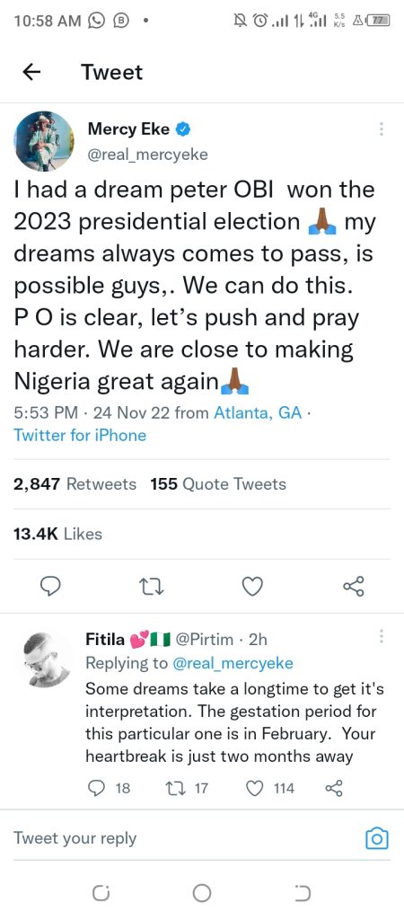 She tweeted, “I had a dream Peter Obi won the 2023 presidential election. My dreams always come to pass. Is(sic) possible guys. We can do this. PO is clear, let’s push and pray harder. We are close to making Nigeria great again.”