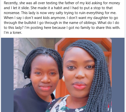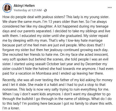 “How do people deal with jealous sisters? This lady is my younger sister. We share the same mum. I’m 13 years older than her. So I’ve always considered her like my daughter,” she wrote.