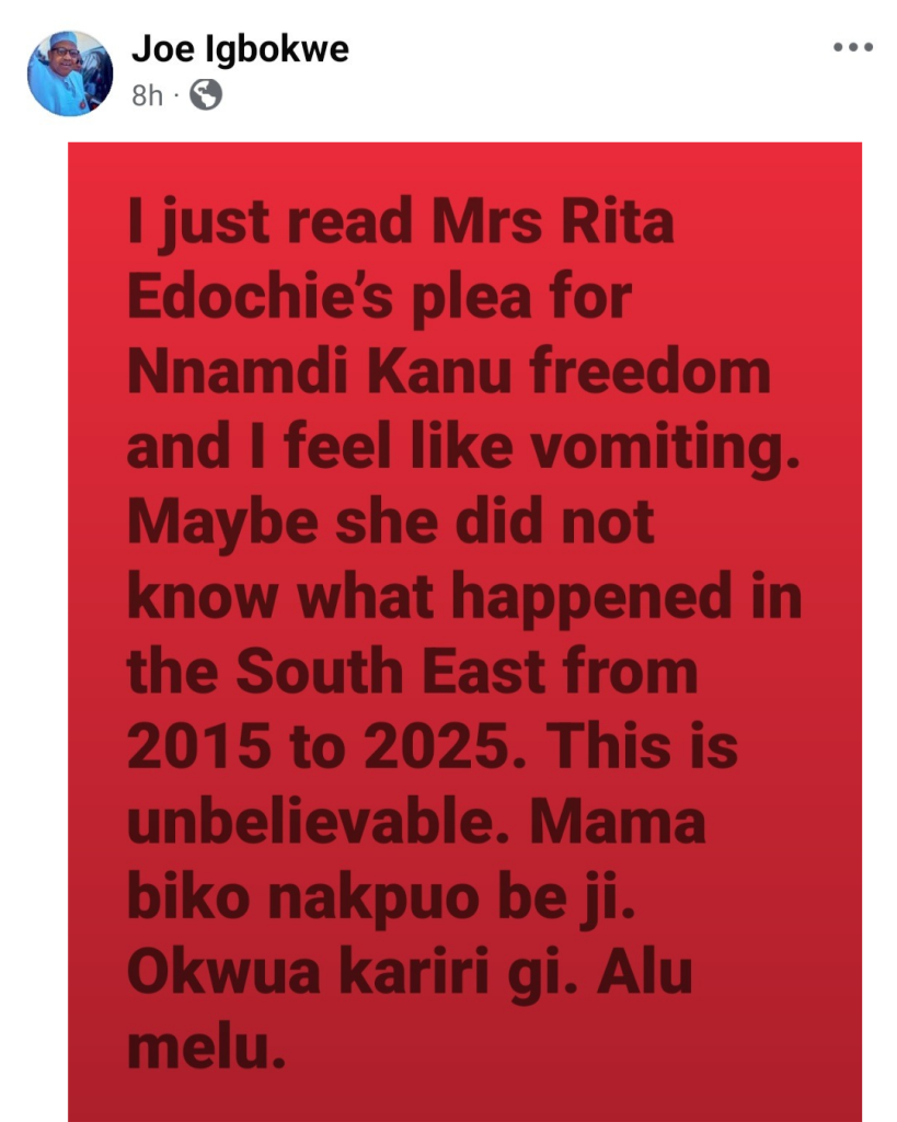 Reacting, Igbokwe wrote on Facebook: “I just read Mrs Rita Edochie’s plea for Nnamdi Kanu’s freedom and I feel like vomiting. Maybe she did not know what happened in the South East from 2015 to 2025. This is unbelievable. Mama biko nakpuo be ji. Okwua kariri gi. Alu melu.”
