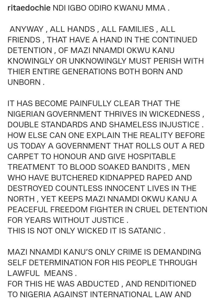 Ms. Edochie had accused the Nigerian government of wickedness and engaging in double standard for still keeping Kanu detained. She then called for his urgent release.