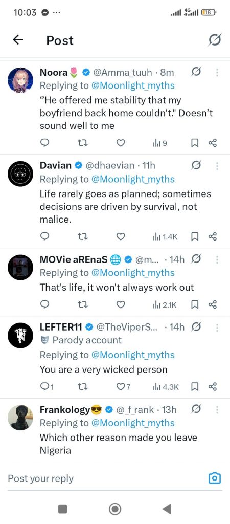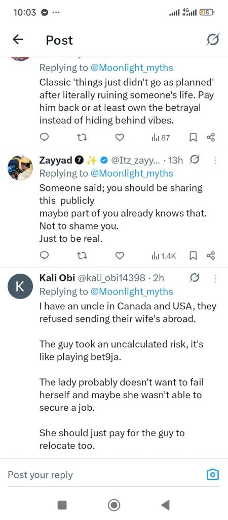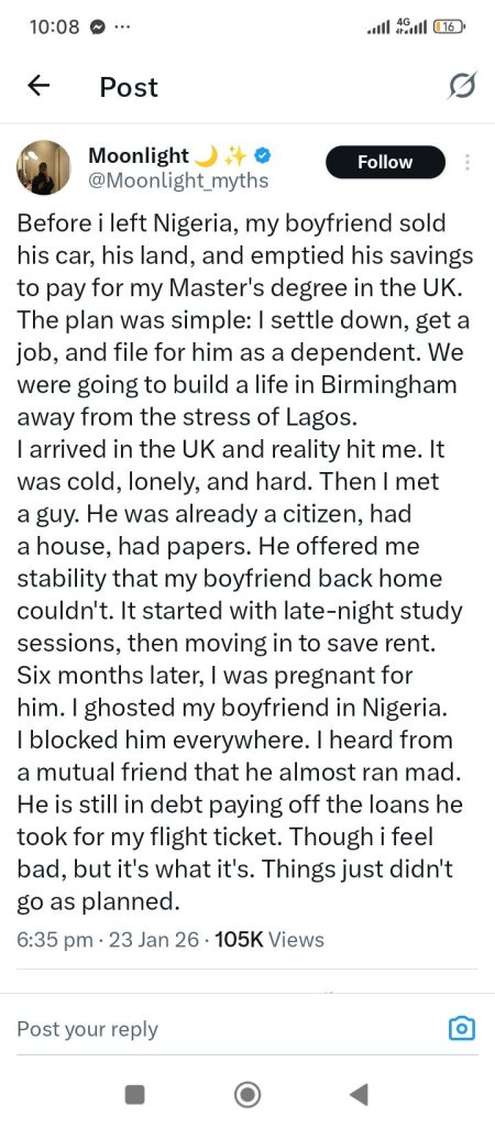 In the post, the woman admitted that her boyfriend in Nigeria sold his car, land, and emptied his savings to fund her education and relocation, with hopes of joining her later.