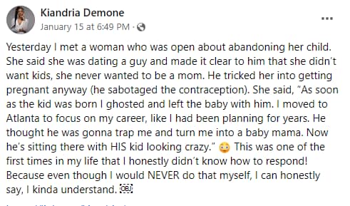 Quoting the lady’s statement, she wrote, “As soon as the kid was born I ghosted and left the baby with him. I moved to Atlanta to focus on my career, like I had been planning for years.”