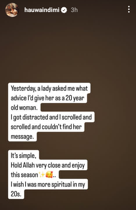 Addressing one of her followers, she wrote; “Yesterday, a lady asked me what advice I ‘d give her as a 20 year old woman. I got distracted and I scrolled and scrolled and couldn’t find the message.