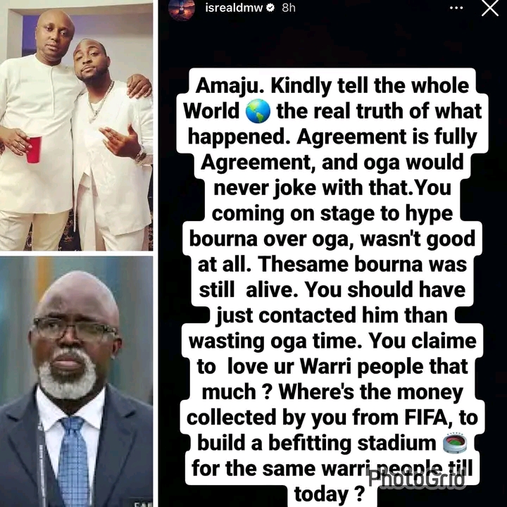 However, Davido’s logistics manager, Isreal Afere, attacks Amaju Pinnick after the former NFF boss called out Davido for failing to attend a show in Warri despite being paid in full.