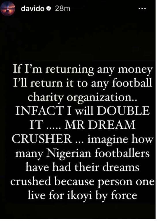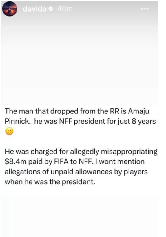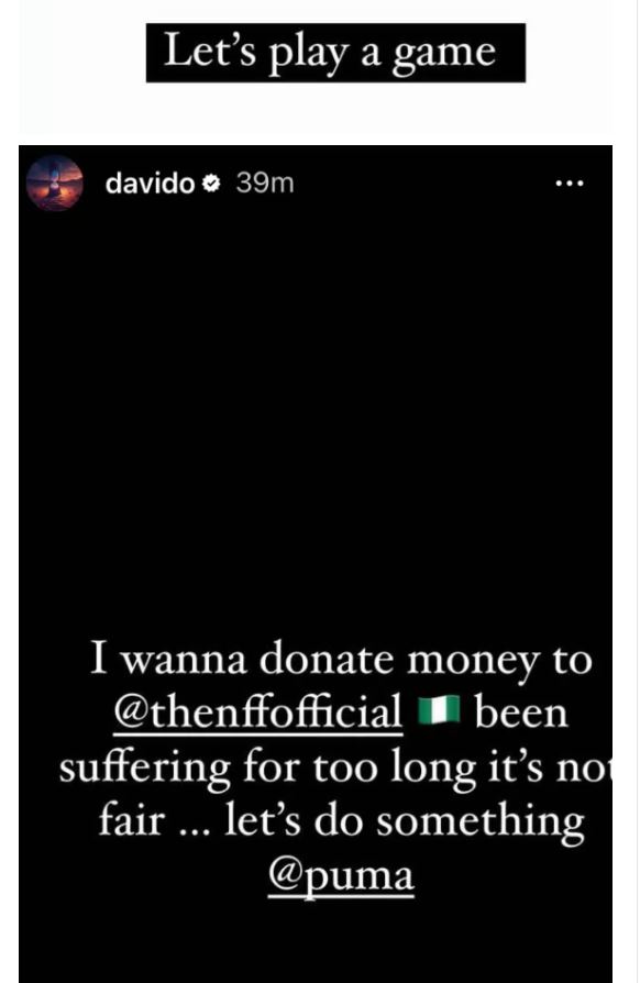 However, hours later, he retired to his Instagram story where he lambasted Amaju Pinnick for embezzling funds paid to him by Fifa. Davido concluded by insisting that the refund for the show will go to charity instead of handing it to Amaju.