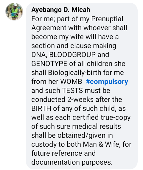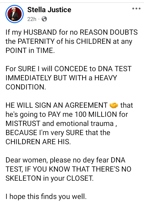“If my HUSBAND for no REASON DOUBTS the PATERNITY of his CHILDREN at any POINT in TIME. For SURE I will CONCEDE to DNA TEST IMMEDIATELY BUT WITH a HEAVY CONDITION. HE WILL SIGN AN AGREEMENT that he’s going to PAY me 100 MILLION for MISTRUST and emotional trauma BECAUSE I’m very SURE that the CHILDREN ARE HIS. Dear women, please no dey fear DNA TEST, IF YOU KNOW THAT THERE’S NO SKELETON in your CLOSET,” she wrote in a Facebook post on Thursday.