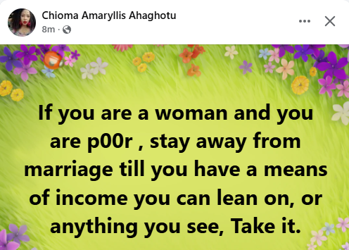 “If you are a woman and you are poor, stay away from marriage till you have a means of income you can lean on, or anything you see, Take it,” she wrote in a Facebook post on Tuesday.
