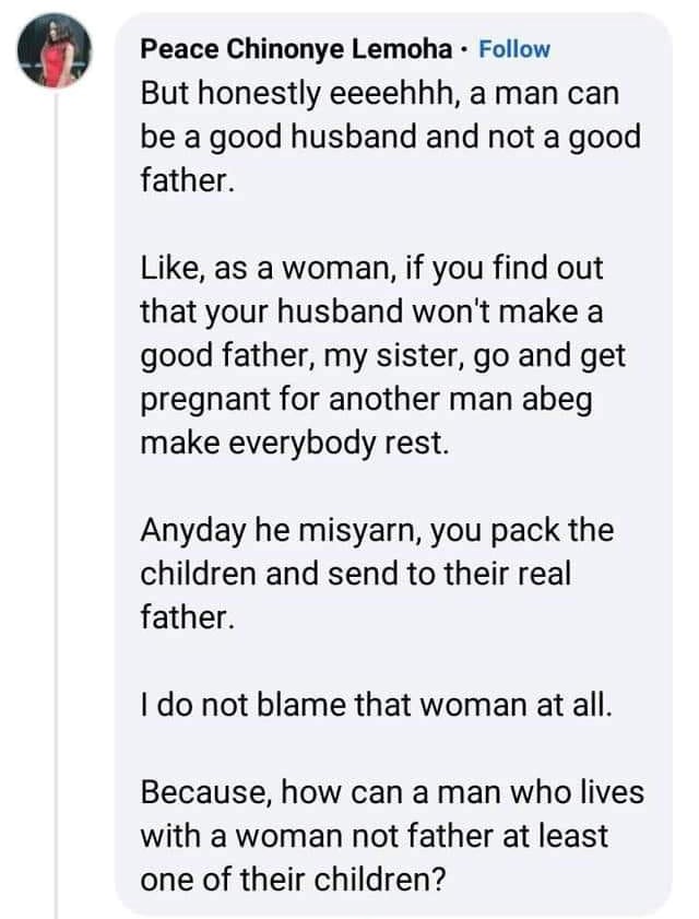 A Nigerian lady, Peace Chononye Lemoha, has said that a woman should get pregnant for another man if she finds out that her husband won’t make a good father.